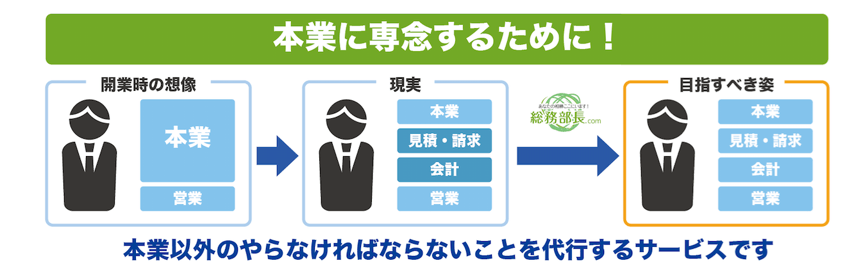 法人、個人問わず代表者の方の業務は多岐にわたります。それは、本業を中心として新しいビジネスを開始したところ、本業の他に代表として(総務部の代わり的に)やらなければならないことが増えてしまい、結果として本業以外の業務をやらざる得ない状況に陥ってしまっていると考えております。