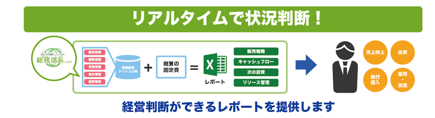 総務部長ドットコムは、貴社からいただいた入力データと固定費やその他費用を組み合わせ、現状の立ち位置をレポートとして出力いたします。経営者はそのデータをもとに次の展開を計画することができるようになります。