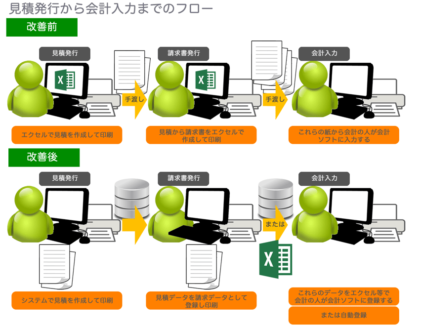 中小企業の事務の効率化は2004年以降、PCの価格破壊やOfficeソフトの拡大により、Officeソフトでの電子化を中心に効率化されてきました。しかし、汎用ソフトであるOfficeソフトでの電子化は、作業を行う方個人のスキルに依存されて、データが散見したり、電子データを紙で出力して、また入力といった非効率を生んでいるのも事実です。